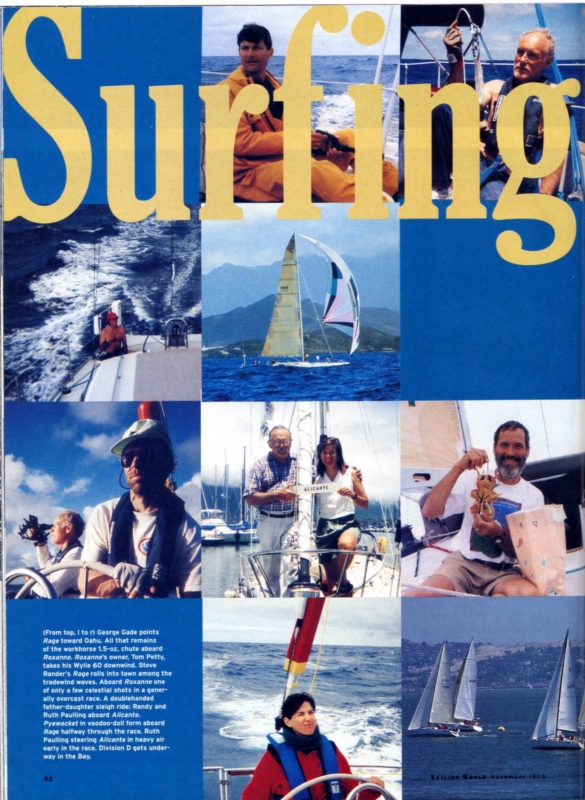 "David: On the day we arrived in hawaii in 1998, Bill took his film to a one-hour photo processing outlet, picked up the photos, and sent them to Sailing World magazine. They included two of the photos with the article on the race (Bill looking despairingly at a broken halyard; Bill taking a sun sight with his sextant while I steer. Unfortunately, the magazine did not properly identify the photos."/a>