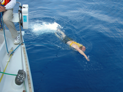 Actually, David did go overboard! Bored as we were, David suggested to check the bottom of the boat for any possible remnants of the spinnacker, which might be stuck at the keel or propeller and slow us down. So he got into the harness, was tethered with a long line, got the diving goggles and jumped into the water. The boat bottom was all ok, but now we got some great pictures of the boat, taken from outside the boat in the middle of the ocean.